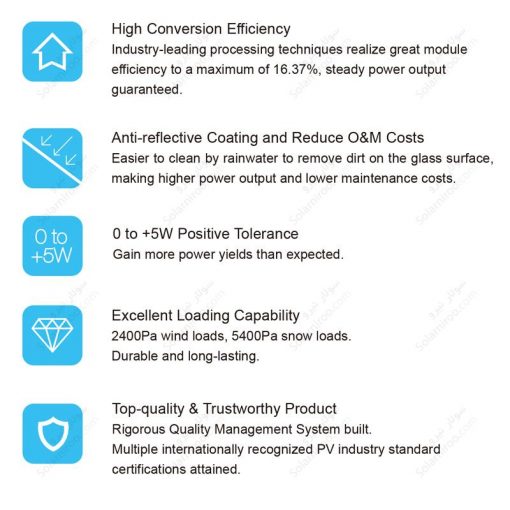 پنل های شرکت ای تی سولار کارکرد خود را در شرایط مختلف اب و هوایی ثابت کرده است . این پنل ها با طول عمر بالا و کارکرد مفید خود گزینه مناسبی برای سیستم های خورشیدی (سولار) هستند . پنل های پلی کریستال ای تی سولار در بازه ی 205 تا 325 وات و مطابق با استاندارد های جهانی تولید میشوند.فروشگاه اینترنتی سولار نیرو نماینده فروش پنل های ای تی سولار است.