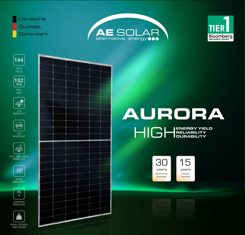 برند آلمانی AE SOLAR تولید کننده پنل خورشیدی با کیفیت نیروگاهی در توان و ابعاد متنوع با راندمان بالا است که محصولات با کیفیت این برند علاوه بر کشورهای اروپایی به ایران نیز صادر می شود. این برند آلمانی است اما تولیدات آن در کشور چین با نظارت و لایسنس خود شرکت AE در آلمان انجام می شود.