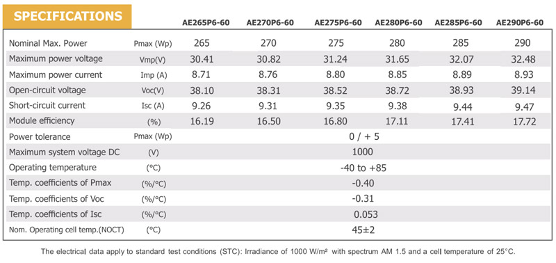 پنل خورشیدی 275 وات برند AE SOLAR از سلول های پلی کریستال تشکیل شده و جزو پنل های 60 سلولی است.